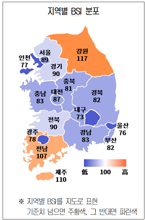 하지만 전북(90), 경기(90), 서울(89), 대전(87), 충남(83), 경남(83), 부산(82), 경북(82), 충북(81), 광주(78), 인천(77), 울산(76), 대구(73) 등은 기준치(100)를 밑돌았다.