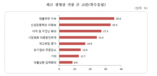 경영상 가장 큰 고민(복수응답)은 35.6%가 '매출하락 지속'을 꼽았다. '신성장동력 미확보'도 33.3%로 많았다. '이직 및 구인난'도 27.3%에 달했다.