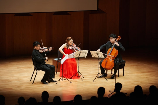예술의전당 공연 모습 비올라, 바이올린, 첼로 연주자가 연주하고 있다/예술의전당