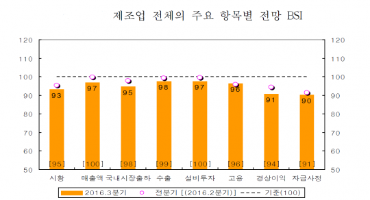 국책연구기관인 산업연구원이 이날 내놓은 3분기 제조업 경기실사지수(BSI)를 살펴보면 시황 93, 매출 97로 기준값인 100을 모두 밑돌았다.