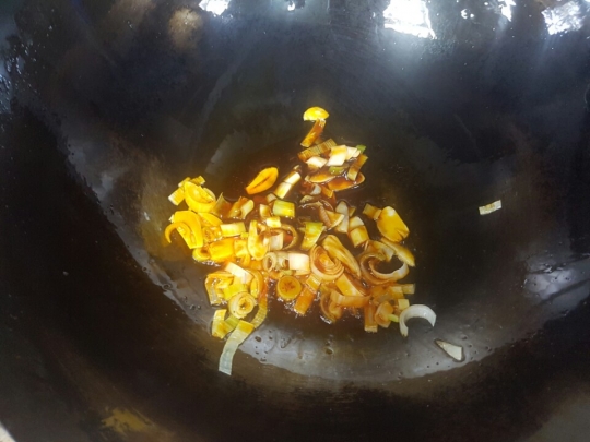2. 프라이팬에 고추기름을 두르고 어슷 썬 대파와 마늘을 넣어 가열한 후 간장을 조금 넣어 향을 낸다.