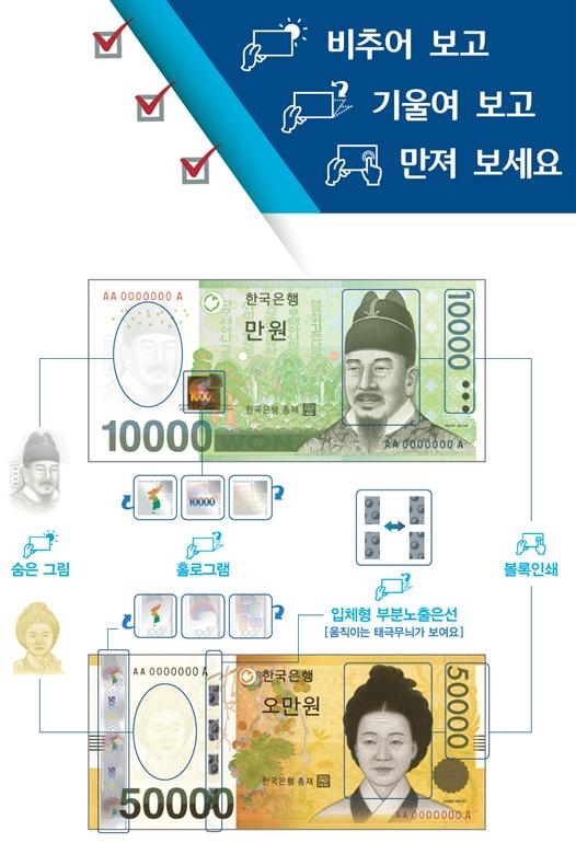 한국은행이 밝힌 위조지폐를 쉽게 확인하는 방법. 다른 은행권을 포함하여 보다 자세한 내용은 한국은행 홈페이지의 '화폐-위조방지장치' 메뉴에서 확인할 수 있다./한은