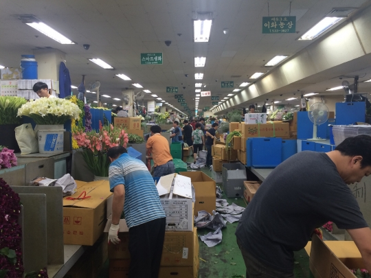 밤 11시45분 "들어가세요"라는 소리에 약 190개 점포 상인들은 일제히 자리를 찾아 나선다. 어두웠던 공간에 불이 들어오고 적막이 흐르던 곳에 사람들로 북적인다. 시간은 자정을 가리키고 있지만 대낮인것처럼 환해진다.이때부터 판매하는 꽃을 정리하는 상인들 사이로 전국 각지에서 올라온 도매상들이 구매할 좋은 물건을 찾기에 여념이 없다.