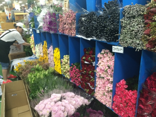 "도매상들이 구매한 제품에 지역을 표시해 주면 용달하는 사람들이 한 번에 가지고 가요. 용달 이용은 꼭 도매상이 아니어도 이용할 수 있어요. 구매한 영수증을 모아 용달하는 사람에게 갖다주면 그들이물건을 주차장까지 배달해줘요. 꽃시장에 와서 구매할 물건이 많으면 이용해보세요."