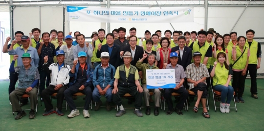지난 5월 26일 NH농협생명 임직원들과 경기 여주시 강천면 도전리 주민들이 명예이장·명예주민 위촉식을 갖고 포즈를 취하고 있다./NH농협생명