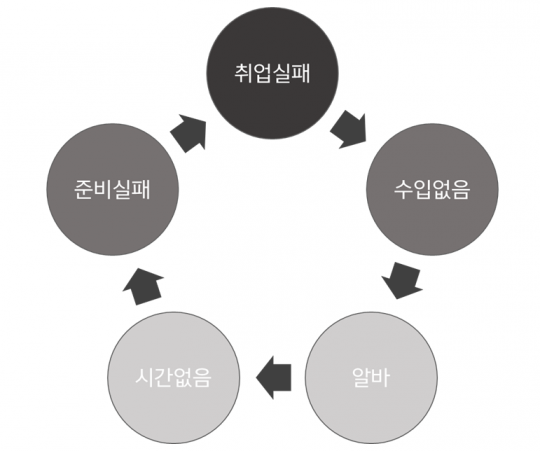 졸업 직후 취업 실패로 인한 자신감 상실 → 취업 실패로 인한 경제적 어려움 → 경제적 불편을 해소하기 위한 단기 아르바이트 → 불규칙한 삶의 패턴 가속화, 낮은 임금으로 인한 다수의 파트타임 아르바이트로 일상생활 붕괴 → 부족한 시간, 무너진 삶의 패턴으로 취업 준비 실패 패턴의 반복이다.