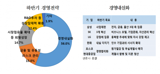 하반기 경영전망이 상반기에 비해 크게 나아지지 않을 것이라는 판단에 따라 기업들이 외형 성장보다는 사업재편, 내실다지기 등 생존력 강화에 치중하겠다는 것으로 해석된다.