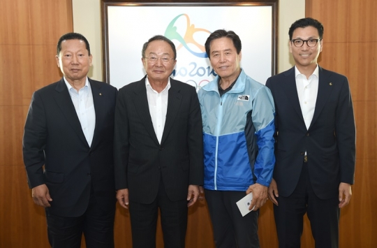 지난달 8일 이수빈 삼성생명 회장(왼쪽 두 번째)과 김재열 제일기획 스포츠사업 총괄사장(오른쪽 첫 번째) 등 삼성그룹 대표일행은 태릉선수촌을 방문하여 리우올림픽에 출전하는 우리 국가대표 선수단의 선전을 응원하고 격려금을 전달했다. (왼쪽부터)김정행 대한체육회장, 이수빈 삼성생명 회장, 최종삼 선수촌장, 김재열 제일기획 스포츠사업 총괄사장./대한체육회