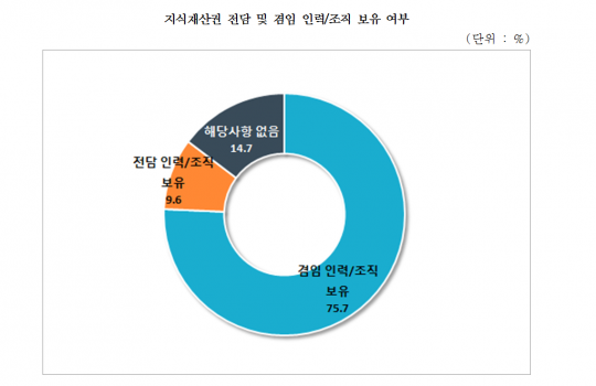 하지만 전담조직이나 인력을 두고 지식재산권을 관리하는 중소기업은 9.6%에 그쳤다. 특히 75.7%의 기업들이 다른 업무를 병행하면서 지식재산권 관련 업무까지 맡도록 하고 있는 실정이다.