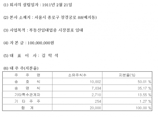 회사의 설립일자는 무려 1911년 2월21일이다. 설립 당시 자본금이 얼마였는지는 알길이 없다. 하지만 재무제표상 현재 자본금은 1억원이다. 이후 증자 등을 통해 1억원으로 늘어났을 것으로 추정된다. 그래도 그 넓은 광장시장을 관장하는 광장주식회사의 자본금이 단 1억원이라니 아이러니하다.