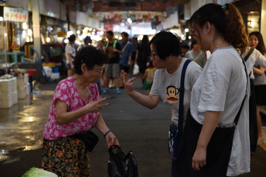 광장시장의 한 상인이 중국인과 손짓으로 대화를 하고 있다. /김승호