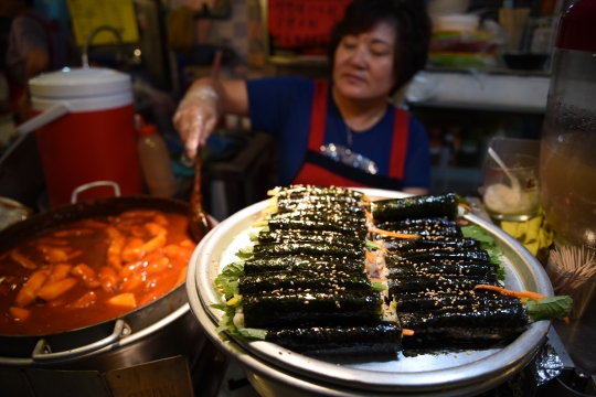 광장시장의 먹거리 명물 중 하나인 마약김밥./김승호