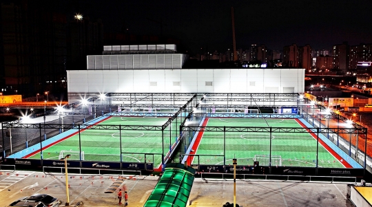 8일 업계에 따르면 홈플러스는 지난 5월 서수원점 옥상에 국제규격 실외구장 2개와 작은 규모 실내구장 2개를 갖춘 풋살 전문구장을 오픈했다. 지역주민, 전문클럽, 유소년 축구팀, 생활축구팀 등이 사용하고 있다. 스포츠 LED 조명으로 야간에도 빛 공해를 최소화했고 이용자들에게 최상의 조도를 제공하는 환경을 구축했다. 구장 주변에는 '둘레 잔디 길'을 조성해 안전한 환경에서 산책이나 조깅도 즐길 수 있도록 했다.