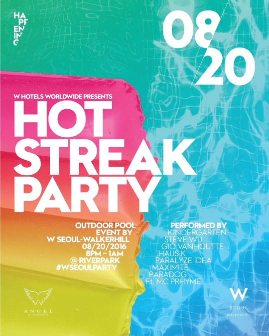 2016년 W 서울에서의 마지막 여름 파티로 화려하게 장식될 'HOT STREAK' 풀사이드 파티는 20일 저녁 8시부터 다음날 새벽 1시까지 '리버파크' 워커힐 야외 성인 풀장에서 열린다. 파티 입장료는 얼리버드 구매 시 5만원, 현장 구매 시 6만원이며 웰컴 드링크 1잔이 제공된다. 만 19세 이상만 입장 가능하다.
