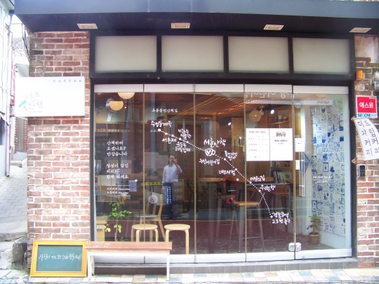 예전에는 수성동 계곡이 산책길의 끝에 자리하는 줄도 모르고 돌아가는 사람들이 많았다고 합니다. 그런데 박노수 미술관에서 조금 아래쪽에 자리한 한 카페 덕분에 그럴 분들이 줄 것 같습니다. 가게 전면 유리 한가득 산책길 코스가 그려져 있습니다. 수성동 계곡-서촌재 갤러리-윤동주 하숙터-누상어린이집-통인시장 정자-대오서점-이상의 집-우리은행 효자동 지점-경복궁역 2·3번 출구. 짧은 가게 홍보 문구는 구석에 자리했는데 "산책하러 오셨나요? 반갑습니다"로 시작합니다. 이런 재치 넘치는 가게들이 산책길 곳곳에 있습니다. '이런 가게의 주인이 되고 싶다'는 생각이 절로 듭니다.
