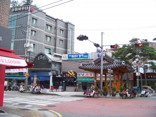 조금 더 내려가면 오늘 이야기의 종점이 나옵니다. 통인시장 입구의 정자입니다. 통인시장은 일제강점기인 40년대 일본인을 위해 세워진 시장인데요, 요즘은 유커들의 발길을 잡아끄는 관광명소가 됐습니다. 시장 이야기도 다음 기회로 미루겠습니다. 정자 인근은 네거리인데 하천길은 정자 오른편의 곡선길입니다. 여기까지가 하천길의 절반인데요, 나머지 소개는 두번째 이야기에서 마저 하겠습니다.