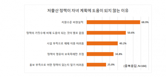 또 '도움이 되지 않는다'고 응답(복수)한 이유로는 '지원수준이 비현실적'(68.9%)이란 답이 가장 많았다. '정책의 가짓수는 많은데 나에게 도움되는 것은 별로 없다'(50.6%)는 지적도 상당했다. 이 외에 '시설이 부족해 필요시 제때 이용이 어렵다'도 40.2%에 달했다.