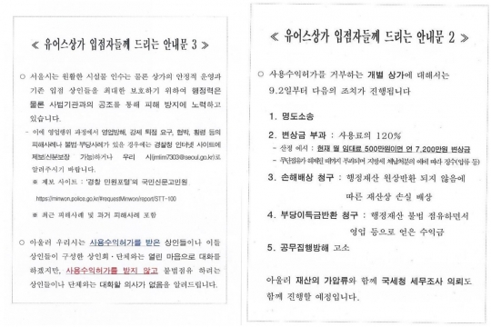 서울시가 시위중인 유어스 상인들에게 보낸 안내문. 불법점유 중인 상인과 단체와는 대화하지 않겠다는 내용이 적혀있다.