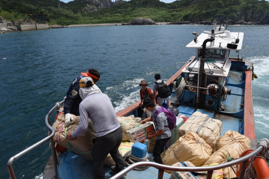 만재도에는 큰 배가 들어갈 수 없어 쾌속선이 도착하면 어선이 마중을 나와 주민들과 짐을 싣고 만재도로 돌아간다. /김승호