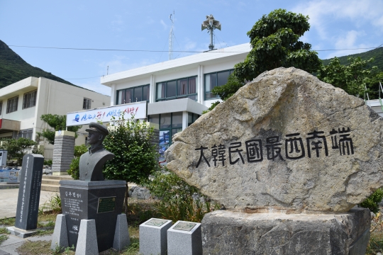 흑산면가거도출장소 앞에 '대한민국최서남단'이란 표지석이 있다. 그리고 그 옆에는 서울 서라벌예고를 다니다 1960년 4·19 혁명 당일 시위에 나섰다 총탄에 맞아 순국한 가거도 출신의 김부련 열사 흉상이 있다./김승호