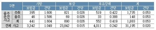 보고서는 또 음주운전사고는 한 번의 사고로 높은 사망보험금과 위중한 사상을 야기할 수 있다고 지적했다. 최근 보험개발원이 발표한 '실제 대인배상 보험금의 지급통계'에 따르면 건당 비음주운전사고의 사망보험금은 1억500만원이지만, 음주운전 사고의 사망보험금은 1억6000만원으로 1.5배나 높다. 또 음주운전 사고의 부상과 후유장해보험금은 비음주사고의 1.7배를 넘는다.
