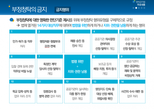 국민권익위원회에 따르면 부정청탁금지법의 핵심 내용은 '부정청탁의 금지'와 '금품 등 수수 금지'다.