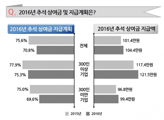 '떡값'으로 불리는 추석 상여금을 지급할 계획이 있는 기업은 70.8%로 나타났다. 이는 전년(75.6%)보다 4.8%p 감소한 수치다. 전년 대비 300인 이상 기업의 경우 2.6%p(77.9%→75.3%), 300인 미만 기업이 5.4%p(75.0%→69.6%)로 기업 규모에 관계없이 모두 줄었다.