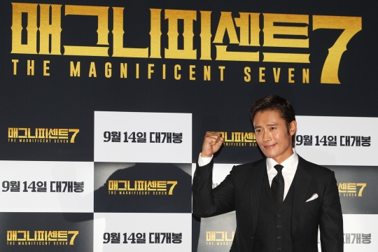 배우 이병헌이 12일 오후 서울 강남구 메가박스 코엑스에서 열린 영화 '매그니피센트 7 The Magnificent Seven' 언론시사회에 참석해 포토타임 갖고 있다.