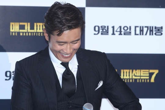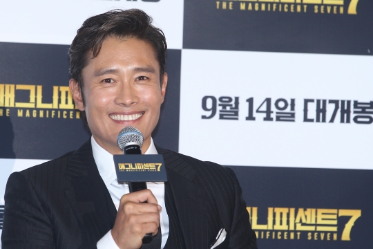 배우 이병헌이 12일 오후 서울 강남구 메가박스 코엑스에서 열린 영화 '매그니피센트 7 The Magnificent Seven' 언론시사회에 참석해 취재진 질문에 답하고 있다.
