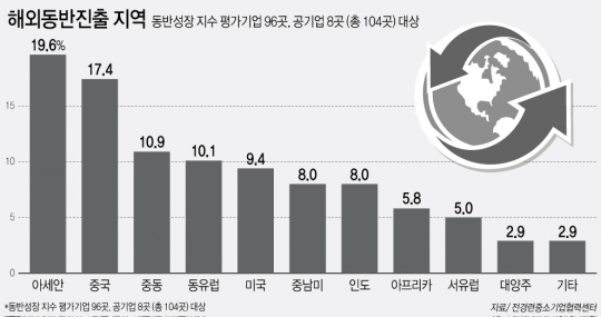 전경련중소기업협력센터가 동반성장지수 평가기업 96곳과 공기업 8곳 등 총 104곳을 대상으로 '해외동반진출 현황 및 우수사례'를 조사해 19일 내놓은 결과에 따르면 응답기업 62곳 중 45곳이 협력사와 손잡고 해외에 진출한 것으로 나타났다. 제조업이 27개사로 가장 많았고 건설 10개사, 도소매 5개사, 정보통신 3개사였다. 이들 대기업의 지원을 받은 협력사는 총 1862곳에 달했다.