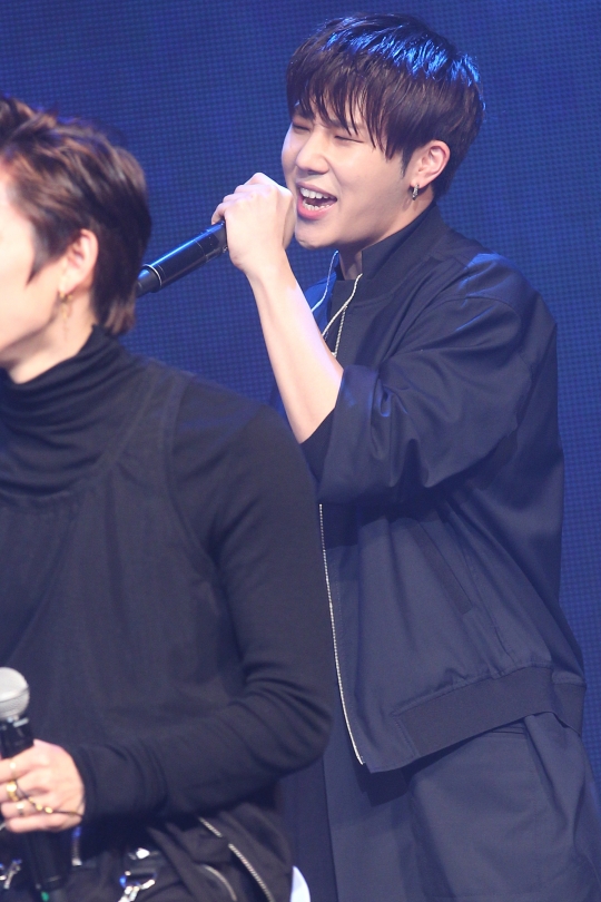 그룹 인피니트의 성규가 19일 오후 서울 용산구 블루스퀘어에서 여섯번째 미니앨범 '인피니트 온리 INFINITE ONLY' 쇼케이스를 갖고 멋진 무대를 선보이고 있다.