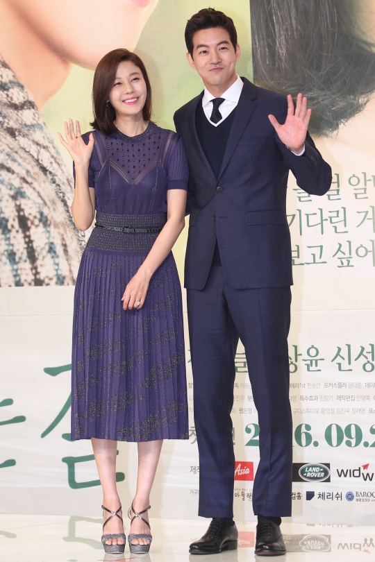 배우 김하늘과 이상윤이 20일 오후 서울 영등포구 타임스퀘어에서 열린 드라마 '공항가는 길' 제작발표회에 참석해 포토타임 갖고 있다.