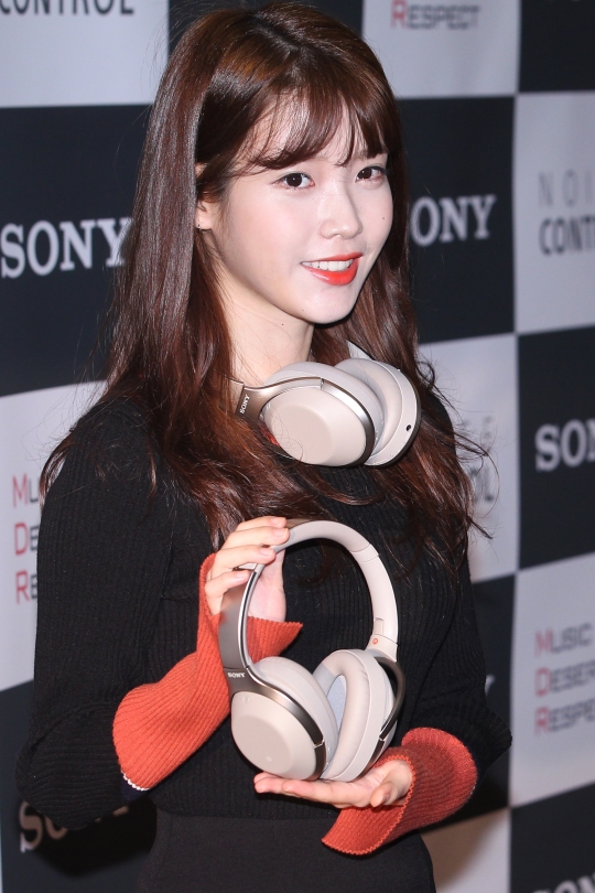 가수 아이유가 21일 오전 서울 소공동 더 플라자호텔에서 진행된 소니코리아의 HRA 블루투스 노이즈 캔슬링 헤드폰 'MDR-1000X' 출시 행사에 참석해 포즈를 취하고 있다.