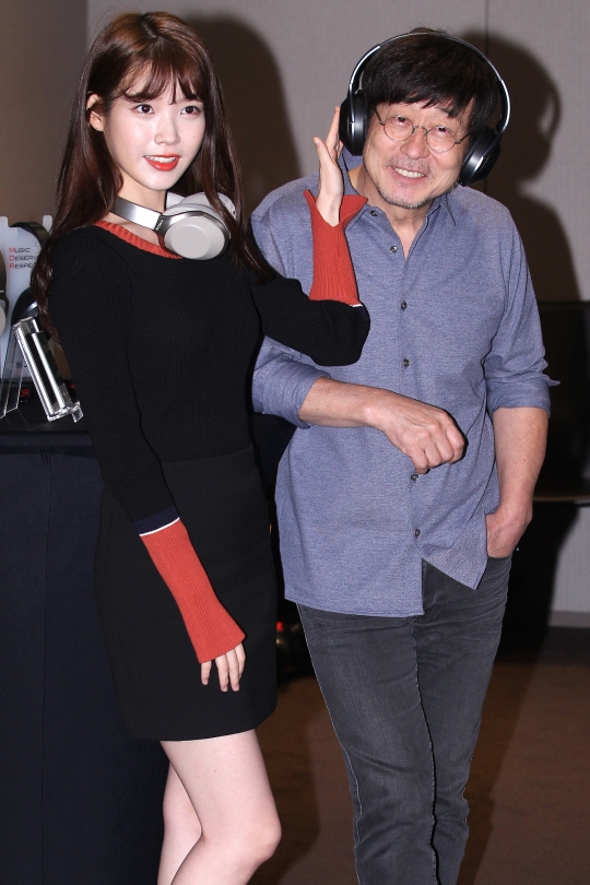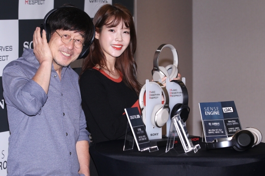 가수 아이유와 김창완이 21일 오전 서울 소공동 더 플라자호텔에서 진행된 소니코리아의 HRA 블루투스 노이즈 캔슬링 헤드폰 'MDR-1000X' 출시 행사에 참석해 포즈를 취하고 있다.