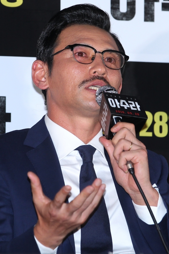 배우 황정민이 21일 오후 서울 성동구 CGV왕십리에서 열린 영화 '아수라' 언론시사회에 참석해 취재진 질문에 답하고 있다.