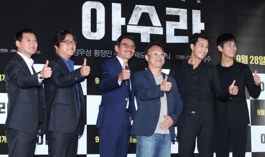 21일 오후 서울 성동구 CGV왕십리에서 열린 영화 '아수라' 언론시사회에 참석한 출연진들이 포토타임 갖고 있다.