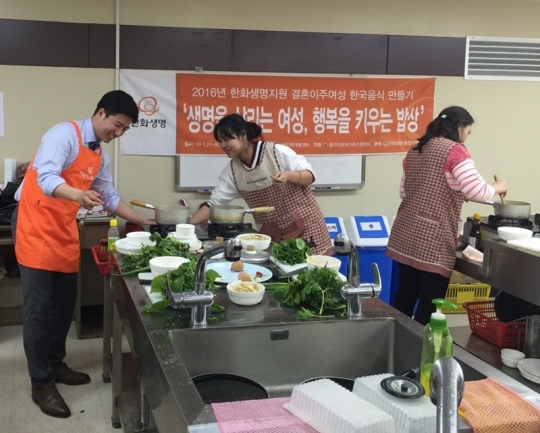 한화생명 충청지역본부 봉사팀은 올 1월부터 3년차 이내의 결혼이주여성을 대상으로 한국요리와 밑반찬 강습 프로그램인 '행복을 나누는 밥상' 프로그램을 실시하고 있다. 가정당 총 16회의 요리교실을 운영하며, 이 중 절반은 남편과 같이 참여해 건강한 가정 만들기에도 도움이 되고 있다./한화생명