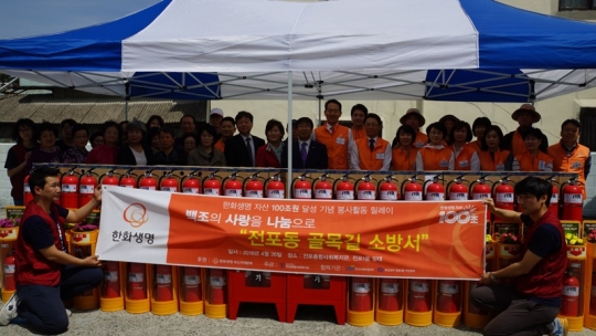 한화생명 부산지역본부 봉사팀은 지난 4월 '한화생명 골목길 소방서' 활동을 통해 부산 전포동 지역의 노후주택과 전통시장 등 소방차 진입이 어려운 화재 취약지역에 소화기를 설치, 화재 발생시 골든타임을 확보할 수 있게 지원했다. 또한 지역의 저소득가정 아이들을 위해 건강한 식습관 교육도 지속하고 있다./한화생명