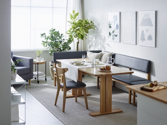 '일로 리빙다이닝 식탁세트'는 카페와 서재 기능까지 가능한 식탁세트다. 특히 20~30평형대 거실에 배치하면 카페 같은 공간을 연출할 수 있다. 높이가 720mm로 일반적인 식탁보다 30mm정도 낮아 식사뿐만 아니라 독서, 학습지도 등 다양한 활동에 편리하게 사용 가능하다. 벤치 의자의 등받이와 좌판에는 쿠션을 내장해 소파와 같은 안락함을 제공하고, 'ㄱ'자 모양으로 구성된 코너형 벤치는 상황에 따라 'ㅡ'자 모양으로 분리해서 사용할 수 있어서 실용적이다. 소재로는 애쉬(물푸레나무)원목과 고무나무 원목을 사용해 내구성이 뛰어나다. 6인 세트는 95만9000원, 4인세트는 67만4000원이다.
