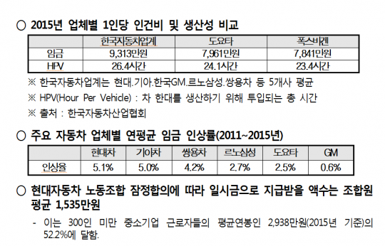 이어 "현대차는 매출액 대비 직접 인건비 비율이 2000년 7.2%에서 2015년 14.3%로 두 배 가까이 상승했는데 이는 도요타 등 일본 자동차 기업에 비해 두 배가 넘는 수치"라고 지적했다.