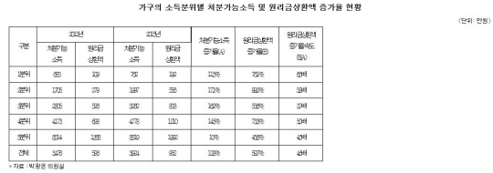 가구의 소득분위별 처분가득소득 및 원리금상환액 증가율 현황. 단위 : 만원./박광온 의원실, 한은