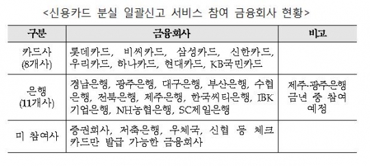 신용카드 분실 일괄신고 서비스 참여 금융회사 현황./금융위, 여신금융협회