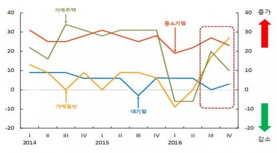 6일 한국은행이 발표한 '금융기관 대출행태서베이 결과(2016년 3분기 동향 및 4분기 전망)'에 따르면 올 4분기 국내 은행권이 예상한 가계와 기업의 종합 신용위험지수 전망치는 31이다. 전분기 27 대비 4포인트 오른 수치다. 특히 가계의 신용위험지수는 23으로, 전분기 20 대비 3포인트 올랐다. 소득수준이 개선될 여지가 적고 부채가 급증하면서 채무상환부담이 는 탓으로 분석된다.