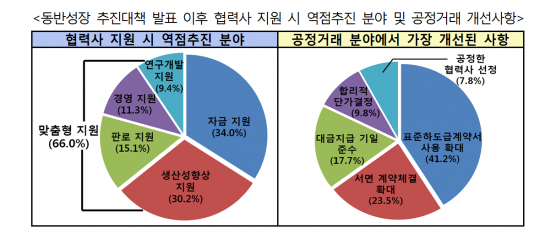 협력사들에 대한 대기업의 도움은 34%가 '자금지원'에 집중됐다. 다만 '공정개선·기술지도'와 같은 생산성향상 지원도 32%에 달했다. 이외에 '판로지원(15.1%)', '경영지원(11.3%)', '연구개발 지원(9.4%)' 등으로 다양화되는 추세다.