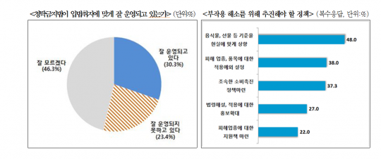 공직사회의 청탁·알선, 금품수수, 직무의 사적남용 등의 관행을 없애기 위해 시행된 청탁금지법이 '입법취지에 맞게 잘 운영되고 있느냐'는 질문에는 '그렇다'는 업체가 30.3%에 불과했다. 23.4%는 '잘 운영되지 못하고 있다'고 응답했다. 46.3%는 '잘 모르겠다'며 판단을 유보했다.