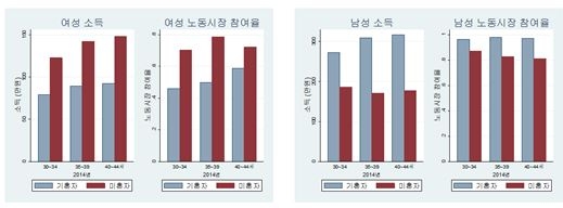 또한 노동시장 참여율과 소득에선 여성의 경우 미혼자가 기혼자보다 노동시장 참여율과 소득이 높은 반면 남성의 경우 여성과 반대로 나타났다. 한국노동패널을 이용한 분석에 따르면 만 25~29세에 70%에 근접하는 여성의 경제활동 참여율은 30대에 50%대로 하락했다.