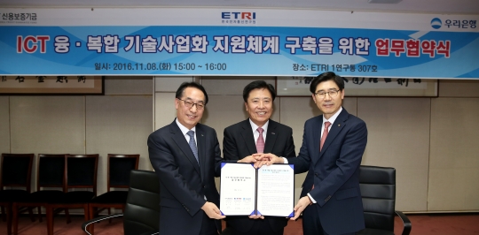신용보증기금은 8일 오후 대전 유성구에 위치한 한국전자통신연구원에서 한국전자통신연구원, 우리은행과 정보통신기술(ICT) 융·복합 기술사업화 지원체계 구축을 위한 업무협약을 체결했다. (왼쪽부터)황록 신용보증기금 이사장, 이상훈 한국전자통신연구원 원장, 이광구 우리은행장./신보
