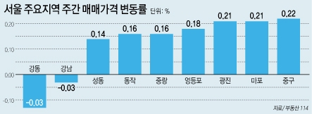 반면 ▲중구(0.22%) ▲마포(0.21%) ▲광진(0.21%) ▲영등포(0.18%) ▲동작(0.16%) ▲중랑(0.16%) 등은 오름세를 보였다. 중구는 황학동 롯데캐슬베네치아, 중림동 브라운스톤서울 등이 500만~1500만원 가량 올랐다. 도심 역세권 아파트로 실입주 문의가 이어졌다.