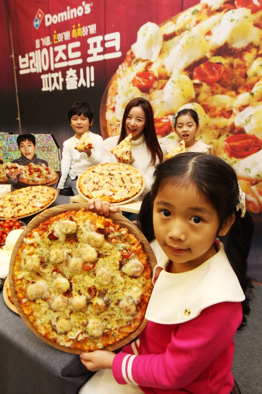 도미노피자가 15일 오전 서울 세종문화회관 예인홀에서 촉촉한 브레이즈드 포크와 그뤼에르멜팅치즈, 생 모차렐라치즈 등 5 가지 프리미엄 치즈를 풍성하게 담아낸 '브레이즈드 포크 피자' 출시행사를 진행하고 있다.