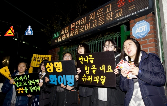 2017학년도 대학수학능력시험 당일인 17일 오전 서울 이화여외고앞에서 각 학교의 응원단이 열띤 응원을 펼치고 있다.